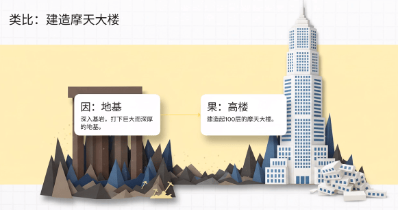 为了活泼地申明这一关系,威科夫使用了一个典范类比:建制一座摩天大楼,必需先打下深挚的地基。你无法正在为两层小屋设想的地基上,建制起百层高的摩天大楼。同样,一个微不脚道的“因”不成能发生一个庞大而持久的“果”。正在“因”尚未建立完成时贸然步履,无异于正在地基还正在挖掘时就起头抢建楼层,其成果必然是灾难性的。