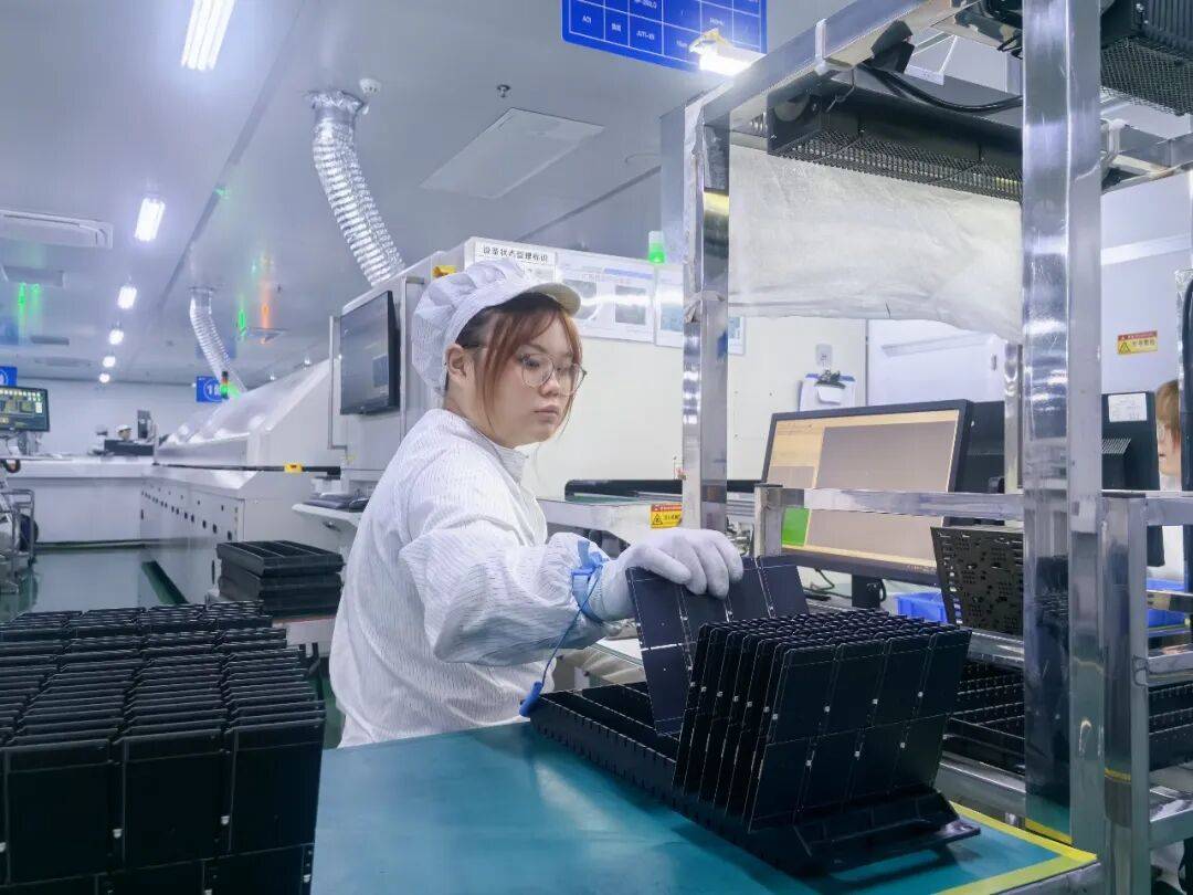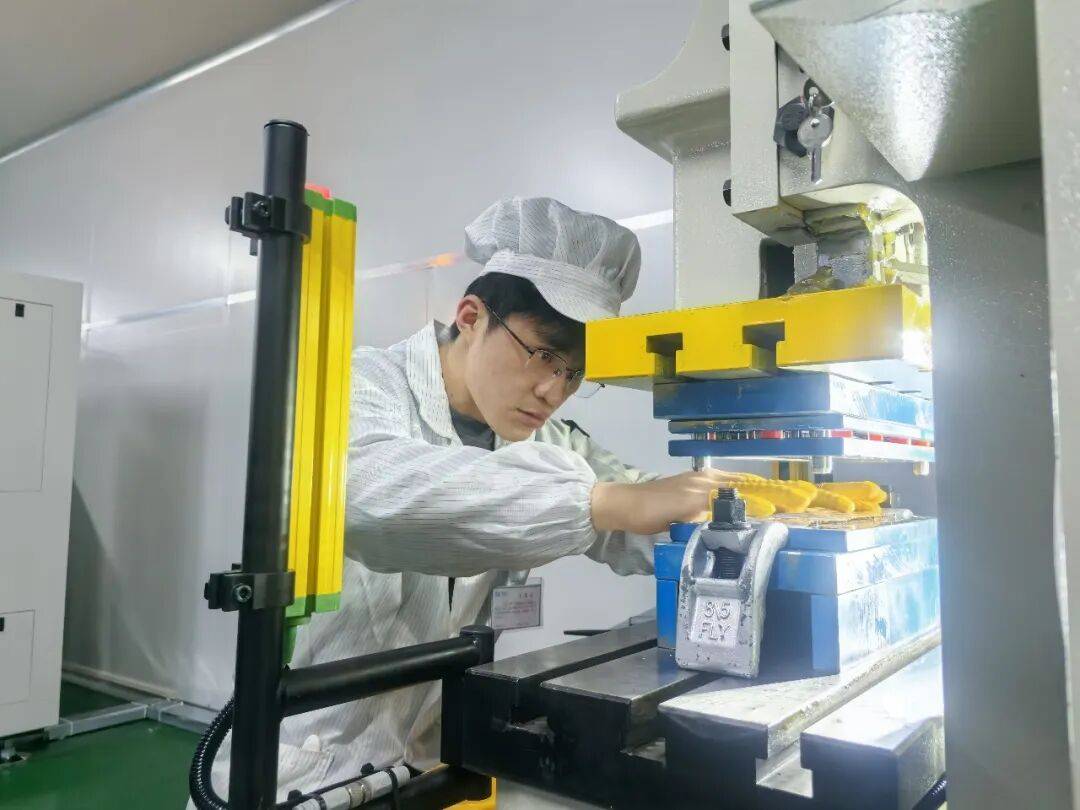 正在冲压区,出产从管尹家锐取操做工夏坤浪正全神贯注地共同完成FPC板(柔性线板)的切割工序。“槽孔对位要精准,确保满有把握。”尹家锐一边关心流程一边激励。