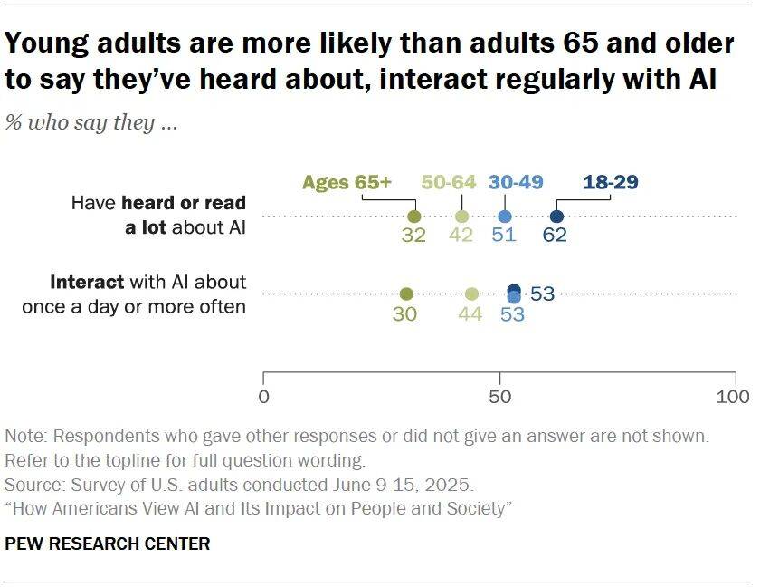 分歧春秋段每用AI的比例对比。18–29岁的年轻人是最屡次、最熟悉AI的群体:53%每用一次以上,远高于65+的30%。33%认为「有必然要挟」;只要23%的人感觉AI不会对他们的将来形成影响。