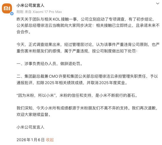 小米公司讲话人发文暗示,1月5日,关于团队取相关KOL接触一事,公司立即启动了专项查询拜访,有了初步结论,且许诺将来不汇合做。1月6日,正式查询拜访成果出来,颠末办理层会商,认为该事务严沉公司准绳,也严沉米粉伴侣们的豪情,属于严沉违规,按公司轨制做出如下惩罚:涉事担任经办人员,做辞退惩罚;集团副总裁兼CMO许斐和集团公关部总司理徐洁云承担办理失职义务,予以传递,扣除2025年相关绩效成就,并打消2025年度金。
